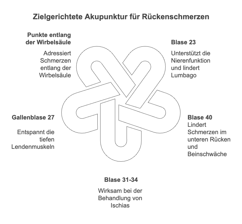 Die Behandlung von Rückenschmerzen konzentriert sich auf spezifische Akupunkturpunkte entlang der Wirbelsäule und im Bereich der Lendenwirbelsäule (LWS). Zu den wichtigsten Punkten zählen Blase 23 und Blase 40, die Schmerzen lindern und die Durchblutung fördern sollen. Blase 23, 1,5 Fingerbreit seitlich des Dornfortsatzes des 2. Lendenwirbelkörpers gelegen, unterstützt den Funktionskreis Niere, kräftigt die Lenden und hilft speziell bei Rückenschmerzen wie Lumbago. Blase 40, in der Mitte der Kniegelenksfalte, wird zur Behandlung von Schmerzen im unteren Rücken und Schwäche in den Lenden und Beinen eingesetzt.